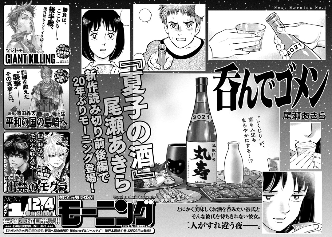『夏子の酒』尾瀬あきら、20年ぶりモーニング登場の新作は、キレ味抜群・滑稽洒脱な“酒蔵ラブコメ”! 読み切り『呑んでゴメン』前後編で掲載