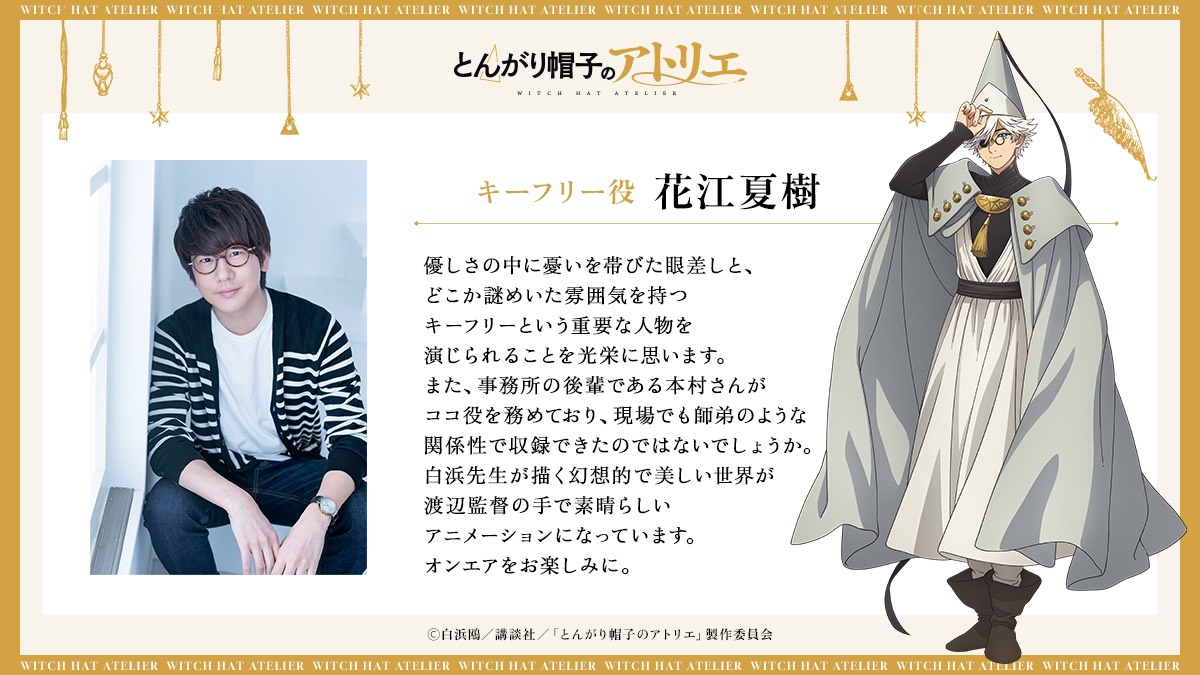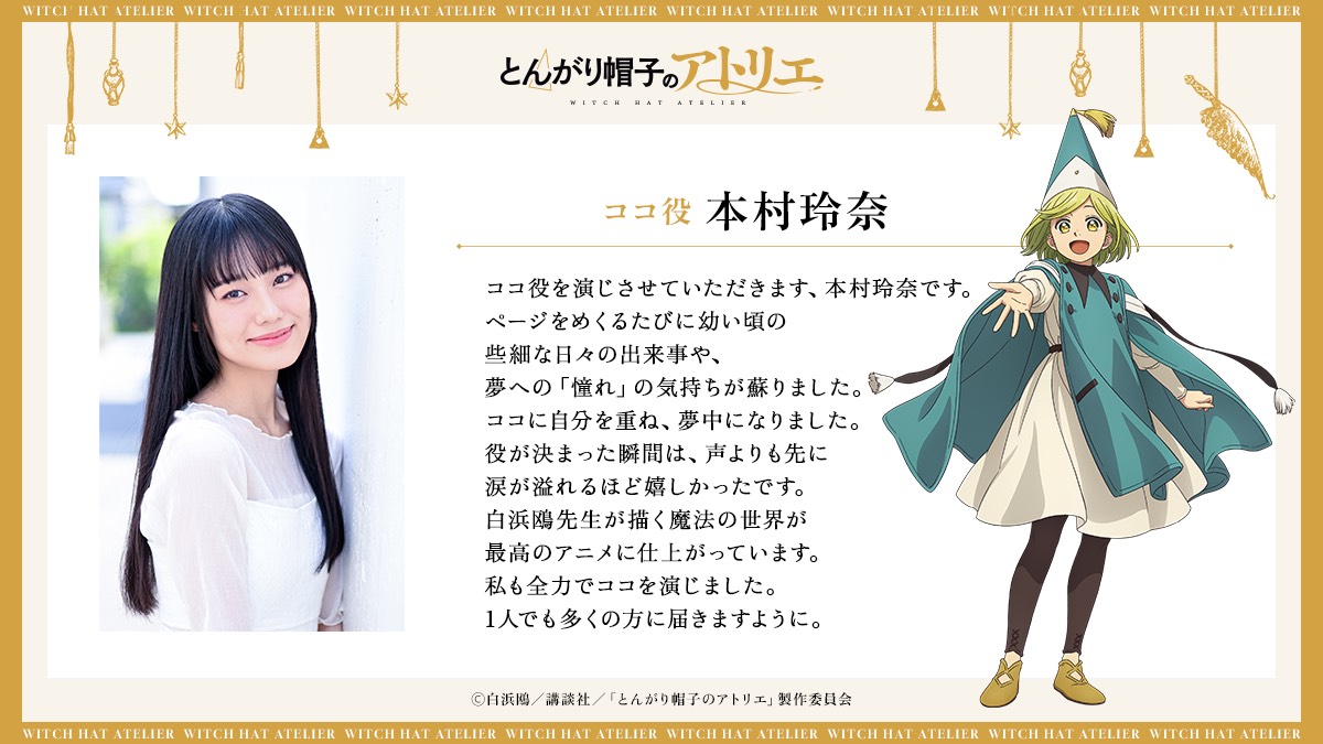 メインキャストとして主人公・ココ役に本村玲奈さん、その師である魔法使い・キーフリー役に花江夏樹さんが決定! ティザーPV内でキャラクターボイスが初お披露目となっています。