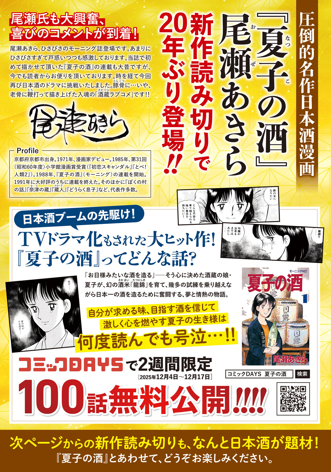 尾瀬氏の20年ぶり本誌帰還を記念して、講談社「コミックDAYS」では12月17日(水)までの2週間限定で『夏子の酒』1~100話無料公開を実施中です!