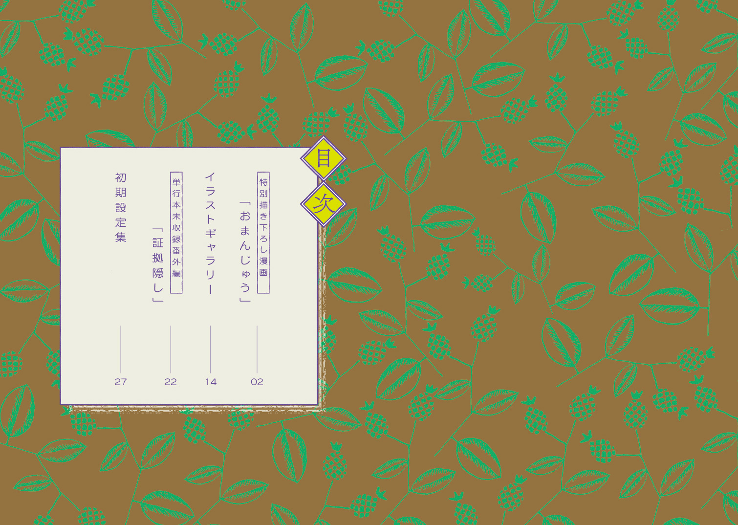 甘すぎる完全描き下ろし漫画「おまんじゅう」をはじめ、粥川氏のコメント付きカラーイラストギャラリー、新規イラストもありの初期設定紹介、さらに単行本未収録の番外編「証拠隠し」を収録した、大充実のファン必携アイテムとなっています。
